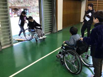車椅子を押す時は、乗っている人が怖くないようにゆっくりと、段差や下り坂では後ろ向きに、曲がる時などは声をかける、などのポイントを確認しながら行いました。