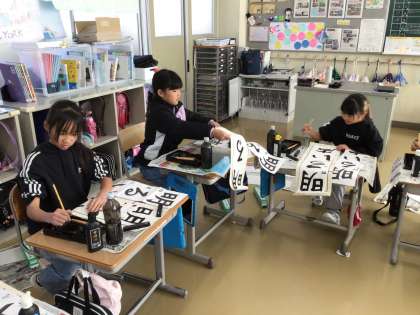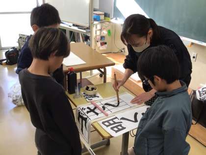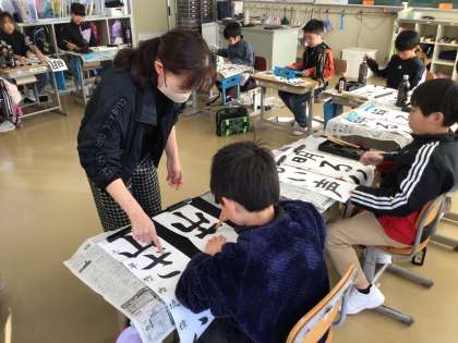 12/12 書写指導(3・4年) 公開日 2025/12/12 更新日 2025/12/12 各学年から 冬休み明けに、書き初め会が行われます。 それに向けて、今年度も二木先生に来ていただき、書写指導をしていただきました。 2時間目は3・4年生です。 3年生は「山ざくら」、4年生は「明るい声」という字を書きます。 上手に書くためのポイントを教えていただきました。