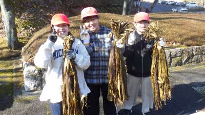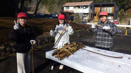 今回は、小原地区の他の小中学生と一緒になって、蒸された枝から皮を剥ぎ取るなどの作業を体験することができました。