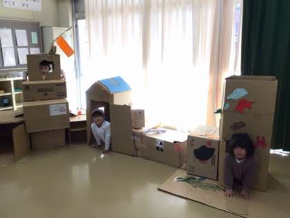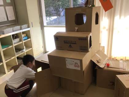 1/19 学習の様子(1年図工) 公開日 2026/01/19 更新日 2026/01/19 各学年から 1年生が、図工「ダンボールに入ってみると」の単元で、ダンボールハウスを作りました。 大きなダンボールを組み合わせ、穴を開けて窓を作ったり、ドアを作ったりしながら、思い思いの家を作り上げました。 楽しく飾り付けもして、みんな素敵な家が完成です。 いろいろなストーリーを考え、楽しく遊ぶこともできました。