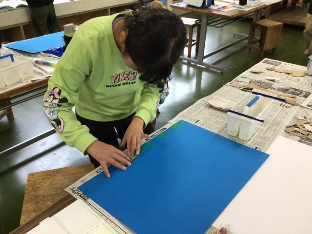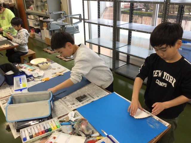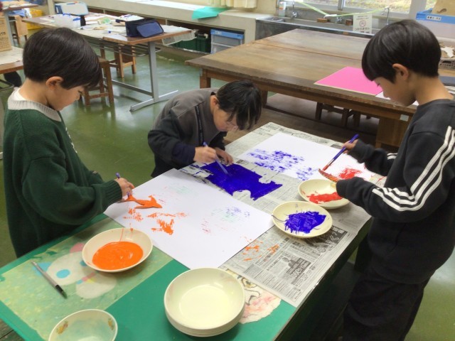 2/25 学習の様子(3・4年図工) 公開日 2026/02/25 更新日 2026/02/25 各学年から 3・4年生が、図工「いろいろうつして」の作品制作に取り組んでいました。段ボールの「なみなみ」の部分を使い、それに絵の具をつけて画用紙に転写していきます。それぞれ形や色を工夫しながら思い思いに作品を作っていました。どんなふうに完成するか楽しみです。 +2