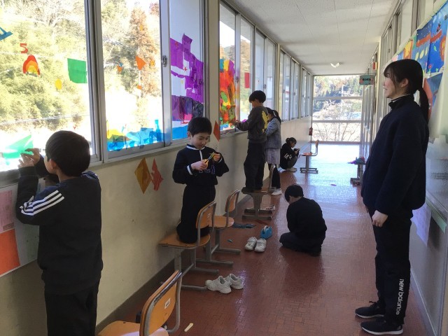 5時間目に、3・4年生が図工「まどをのぞいて」の作品制作を行っていました。窓から...