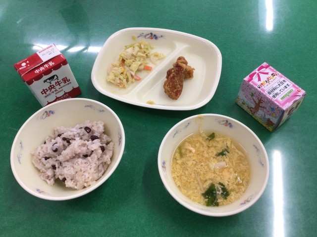 今日の給食は、卒業お祝い献立です。内容は、赤飯、かき玉汁、鶏肉の唐揚げ、れんこん...