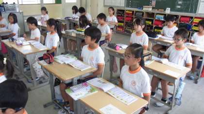 写真はよい姿勢で先生の話を聞く4年生の児童です。