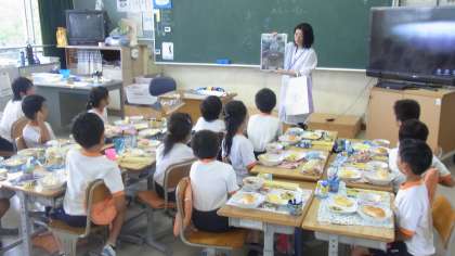 写真は、2年生に給食づくりの様子を伝える栄養士さんです。