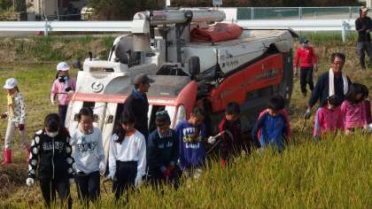 6月に田植えをした稲が、今年も「はっぴー農産」さんのおかげでたくさん実りました。5年生が総合的な学習の時間に、「はっぴー農産」のみなさまのご指導で、稲刈りをしました。