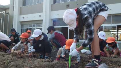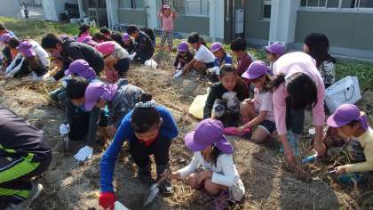 伊保こども園の年長さんが、伊保小学校へ芋掘りに来ました。5年生がお世話をして、いっしょに芋掘りをしました。野菜名人さんがお世話をしてくださった畑は、サツマイモでいっぱいです。大きくなった芋を、協力してていねいに掘っていました。