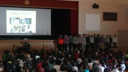 2月23日に行われた全校集会では、6年生全員が、全校に向けて残された小学校生活をどのように過ごしていくか、決意表明を行いました。