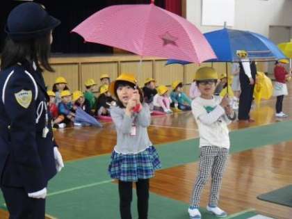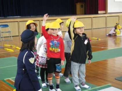 4月18日(月)、本校の体育館で1年生を対象に校内交通安全教室を行いました。交通安全協会豊田支部の交通安全指導員さん7名をお招きして、横断歩道の渡り方や傘を持って安全に歩く方法を学びました。