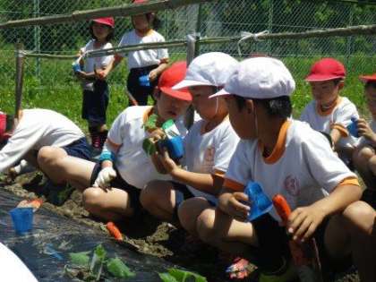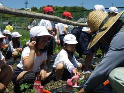 5月12日(木)、2年生が小学校の校舎裏に広がる学校園に苗植えを行いました。野菜名人(宮川さん、平野さん、加納さん)に苗の植え方や育て方について丁寧に教えていただいた後、苗を植えました。去年の野菜栽培の経験を活かして植えることができました。