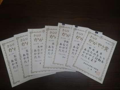 伊保小学校の善行表彰である「きらりかがやき賞」の表彰を、6月7日(火)の4年1組を皮切りにスタートしました。担任の先生からだけでなく、教頭先生や上級生、友だちからの推薦もたくさんありました。この1年間で一人一回はこの賞を受け取ることができるように、児童の良いところを見つけていきたいと思います。それにしても、賞を受けた子のうれしそうなこと・・・。