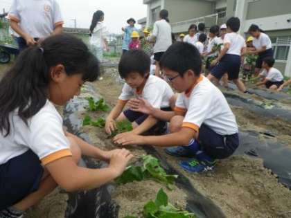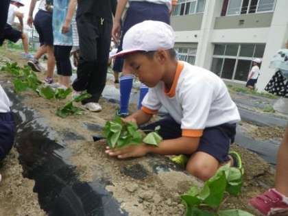 6月17日(金)に、サツマイモの苗植えを行いました。今年は全校児童がフレンド班で行いました。まず、6年生が野菜名人から植え方を教わりました。そして、1〜4年生は、6年生に植え方を教えてもらいながら、苗を植えました。この活動は、特色ある学校づくり推進事業「地域の教育力を生かす取組」です。