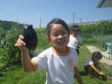 6月21日(火)、朝までの大雨が嘘のように、昼前には晴れ間が広がりました。雨が降ると畑に近づくことができず、ついつい野菜の収穫が遅れてしまいます。その間に、スーパーの野菜売り場では見たこともないようなビッグサイズのキュウリやナスが・・・。給食後の休み時間に急いで収穫に向かいました。あまりに大きくて地面にゴロンゴロン。土が付いていたってきれいに洗えば大丈夫。家に持って帰って、おいしく食べてね。