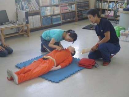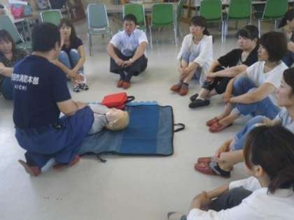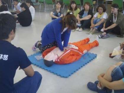 7月7日(木)の午前中、PTA児童委員会が主催する救急救命講習会が行われました。この日は、消防署より2名の職員の方をお招きして、心臓マッサージや人工呼吸、AEDの使用方法などについて実習をしました。参加された保護者の皆様は、この夏休みに行うプール開放の際に、監視員を引き受けてくださる方です。いざという時のために、本当に熱心に講習を受けてくださいました。プールサイドでの監視はたいへんですが、子どもたちの安全のために、よろしくお願いいたします。