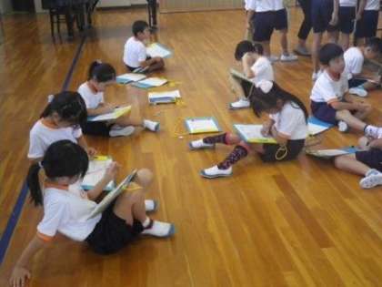 本日、9月6日(火)より毎年恒例の「夏休み作品展」を始めました。9日(金)の学校公開日まで展示します。児童は早速、展示された作品を鑑賞し、1年生は感想を記録していました。毎日、児童の在校している時間帯(およそ朝8時〜夕方5時ごろ)に作品をご覧いただくことができます(最終日9日は正午まで)。会場は体育館と校舎内のワークスペースなどです。体育館は防犯上、施錠していることがあるかもしれません。その場合は、職員室へ声をかけてください。学年によっては、教室の廊下などにも作品が展示してあります。事前にお子さんに作品の展示場所を確認しておかれると良いかと思います。ご来校ついでに学校内もゆっくりご見学ください。
