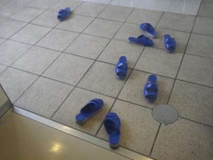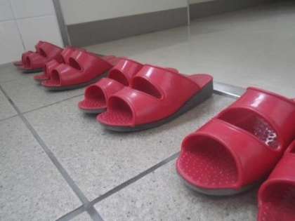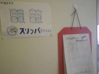 3時間目に校内を回っていると、ある男子トイレから「泣き声」が聞こえてくるような感じがしました。校長先生が、「おや?」と思ってのぞいてみると、1枚目の写真のような状態でした。「泣き声」の正体は、どうやらスリッパ君だったようです。残念です。いったい、どう脱げば、こんなに散らかってしまうのでしょう?保健委員会の手作りポスター「スリッパをそろえよう」と、「せいとんチェック表」が貼られていました。ポスターとチェック表の泣き声も一緒に聞こえたのかも知れません。でも、ある女子トイレでは、「ピシッ!」という音が聞こえてきそうなほど、スリッパちゃんが綺麗に整列していました。それが3枚目の写真です。(保護者の皆様、これらの画像を、ぜひお子さんに見せてあげてください)