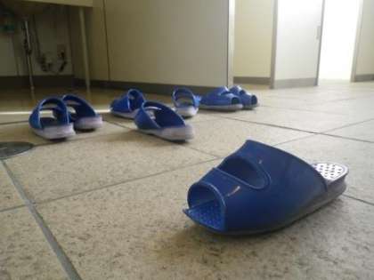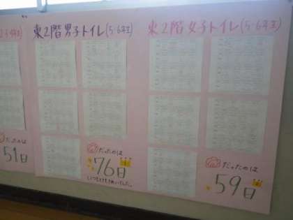 以前にも一度ホームページで紹介させていただきましたトイレのスリッパ整頓。その後の様子ですが、完璧に近づけるためには、なかなかの長期戦になりそうです。養護教諭の先生が毎日1度は各トイレの整頓状況を調べています。90日間調査した結果を、保健室前に掲示しました。きちんと整頓されていた日数が半分を超えていますから、悪くはないのかもしれませんが、私は毎日、校内を回る際に、ちょいちょい並べ直しています。今日、5時間目の授業中に回ったら、写真のような感じでした。子どもたちの意識が高まるように、私が「スリッパ整頓隊」の隊長になり、隊員を募集しようかと考えています。隊員希望のお子さんがいたら、校長まで申し出るように勧めてみてください。