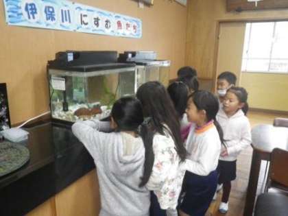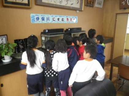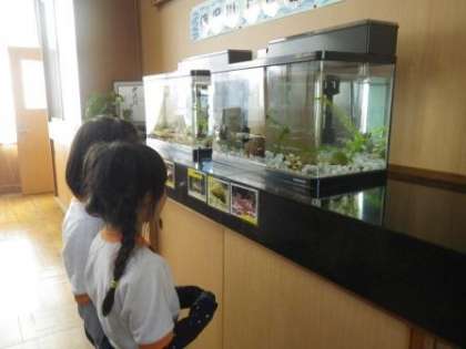 保見町農地環境保全会の方々のご協力によってできあがった「校内水族館」に子どもたちが集まるようになってきました。校長室に入ることに抵抗が少ない低・中学年の子が多く入ってきますが、最近は5年生や6年生の子も魚の様子を見に来るようになりました。今のところは、入室や退室の時にしっかりあいさつをする子ばかりで、行儀良く水槽を見学しています。時には一人で入って来る勇気のある子もいます。入って来た子たちには、私も仕事の手を休め、できるだけ話をするようにしています。校長室や職員室は入りにくい場所ですが、そういう空気も少しは残しつつ、だれもが等しく入ることができる場所にしたいと思います。保護者の皆さんもご来校の際にはぜひお立ち寄りください。
