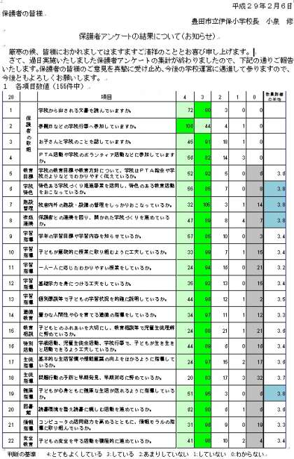 保護者の方より頂きました学校アンケートの集計結果を掲載しました。クリックしてご覧下さい。