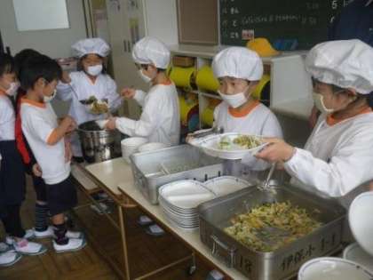 今日から1年生の給食が始まりました。担任の先生からのていねいな注意を聞きながら、お友だちと力を合わせて上手に準備ができました。今日の献立は、やきそば、米粉パン、シュウマイ、ごぼうサラダ、牛乳で、比較的、配膳しやすいメニューでした。これからご飯や熱い汁などが出てくると、もう少し大変になるかと思います。全員が残さずに食べきれるように、最初はやや少なめの配膳になりますが、たくさん食べられそうな子は、「おかわり」をすることになります。学校給食を通して、好き嫌いが少しでもなくなると良いですね。