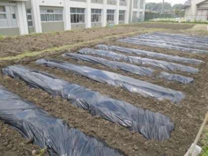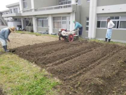 4月24日(月)、朝から3人の「野菜名人さん」が来校して、学校園の畝づくりをしてくださいました。耕運機と鍬を使って、夏野菜やさつまいもが植えられるように何本もの畝を作り、雑草を防ぎ、乾燥を防ぐためのマルチシートをかぶせてくださいました。今週は天気の様子を見ながら、1・2年生が水曜日にキュウリやナスなどの夏野菜の苗を植える予定です。その時にも、「野菜名人さん」がお手伝いをしてくださる予定です。その模様は、またホームページや学校だよりでお伝えします。