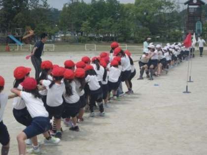 いよいよ運動会の週になりました。今日は2時間目に全校種目の練習を行いました。まず、全校男子の紅白対抗帽子取りの練習でした。低学年と高学年に分かれて帽子取りを行い、その後、くす玉割りを行います。今日はくす玉はありませんでしたが、帽子取りは実際に行ってみました。勢い余って転倒する子もいましたが、大きなケガはありませんでした。後半は全校女子の綱引きを行いました。練習とは言うものの、本気モードの熱戦でした。また、午後からは低学年が暑い中「ドキドキ☆恋☆ダンス」の練習を行いました。とても可愛く、完成に一歩一歩近づいていました。