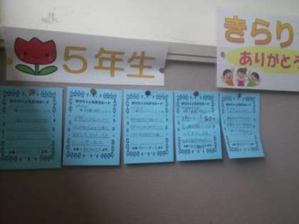 運動会が終わり、学校に落ち着きが戻ってきました。運動会が終わった今週から「きらり☆ともだちカード」の取組を始めました。これは、今まで教師の推薦で子どもたちに与えられた「きらりかがやき賞」に加えて、子どもが子どもを推薦する形で、良い行いを認め、ほめ、励ましていこうとする取組です。子どもたちは、友だちの良い面を探しながら、カードを作成しています。カードは各学年の掲示板に貼り出すようにしています。学校公開日などでご来校の際に、ぜひご覧ください。なお、これまで行っていた「きらりかがやき賞」は、今後も継続して行っていきます。
