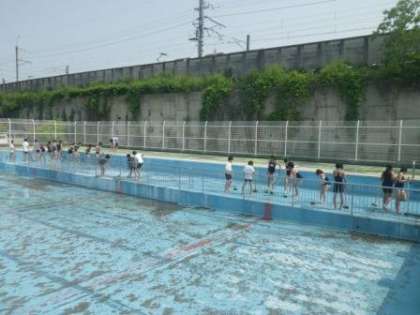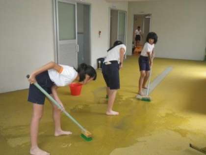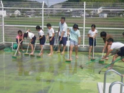 もうすぐ水泳の授業が始まります(高学年児童によるプール掃除の様子)