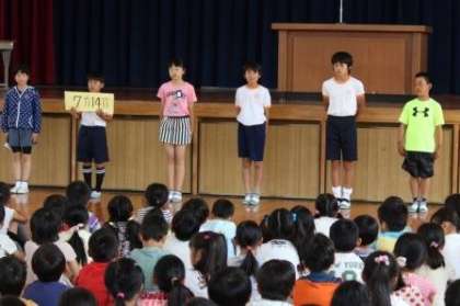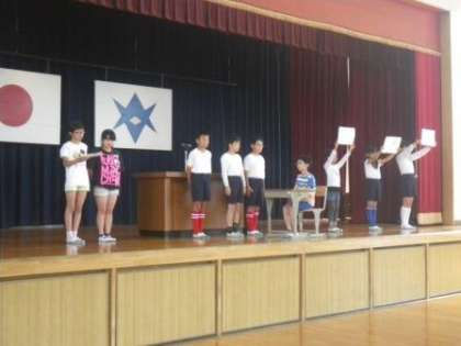 今朝は、全校児童が体育館に入り、全校集会を行いました。校長からの講話の後、先週から本校で実習を始めている教育実習生のあいさつや、保健委員、6年生代表からの連絡、生活担当教師の話などがありました。保健委員会からは今日から始まる姿勢強調週間について、実際に椅子に座って、正しい姿勢の見本をわかりやすく示してくれました。1年生や2年生には特にわかりやすかったのではないかと思います。6年生代表からは、7月14日に実施予定の「いぼリンピック」の予告がありました。夏休みを前に、また一つ、学校へ来る楽しみができました。