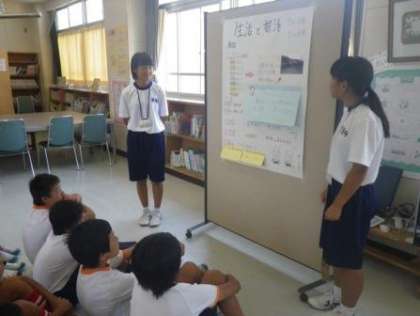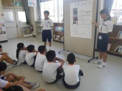 保見中2年生の4名の3日間の職場体験学習が、今日で最終日を迎えました。今日は、4時間目に図書室で4名の中学生が、6年生に対して、中学校生活の様子を説明してくれました。職場体験の合間を縫って、説明用のパネルを準備し、とてもわかりやすく学校生活や授業、行事の様子、部活動の特色などを聞かせてくれました。さすがに中学生だけあって、小学生には見られないプレゼンの技術を持ち合わせていて、6年生は食い入るように4人の説明に耳を傾けていました。6年生にとって、中学校を身近に感じ、進学への意欲を高める、とても良い機会でした。4人の中学生、ありがとう。