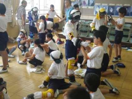 6月22日(木)、豊田市社会福祉協議会の皆さんを講師にお招きして、5年生が高齢者擬似体験の学習を行いました。はじめに高齢者の日々の生活について、講師の方からお話をお聞きしたり、意見を交換したりしました。次に高齢者体験用の装具を身に着け、「およそ80歳の体」になって、階段を上り下りしたり、ペットボトルのキャップを開けたり、文字や色を見たりする体験をしました。これらの学習から高齢者の方の日常生活の大変さを学ぶだけでなく、介助する側の心構えについても学ぶことができました。5年生は、今後も「福祉」をテーマに学習を深めていく予定です。