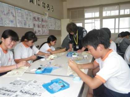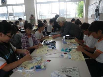 小学校の家庭科では、生活に役立つ物の製作を学ぶ場面があります。布を用いて、手縫いや、ミシンを用いた直線縫いにより目的に応じた縫い方を考えて製作し、活用できることを目標に5年生や6年生で、手縫いやミシン縫いに取り組みます。昨日は、5年生の手縫い(なみ縫い、玉止め)の授業に、地域の「つむぎの会」の皆さんがボランティアとして、児童の作業のお手伝いに来てくださいました。教師一人ではなかなか児童一人一人に目が行き届かない中、多くの「裁縫名人さん」が寄り添ってくださることで、児童は技能をより正確に早く習得することができます。「つむぎの会」の皆さんには、今後も家庭科の授業でお世話になります。