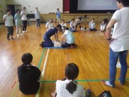 今日は、伊保小学校PTA児童委員会が主催する救急救命法講習会を、体育館で開催しました。夏休みのプール開放の際に監視員を務めてくださる方を中心に40名近い保護者の方にご参加いただきました。消防署員とサポーターの方からの説明を受け、参加者一人一人が交替しながら、胸骨圧迫、人工呼吸、AEDの使用法などを学びました。この講習は教職員も高学年児童も学んでいます。水泳に限らず、日常生活でも万が一の時には役立つはずです。今後もぜひ多くの方が、このような講習の機会に積極的に参加し、一つでも多くの命を救っていきましょう。