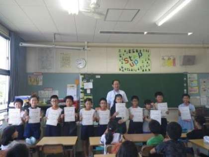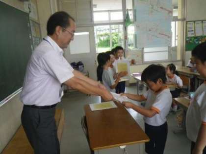 夏休みを前にして、各学級の担任は「きらりかがやき賞」の準備を進めています。今週は3年生、4年生、1年生の教室にきらりかがやき賞を渡しに出向きました。子どもたちは、とても嬉しそうに賞状を受け取ってくれます。家に持って帰って、子どもたちはちゃんとお父さんやお母さんに見せていますか?ランドセルの中で、くしゃくしゃになっていませんか?お家のどこかに少しの間でも良いので、飾っていただけると嬉しいです。ぜひ、お父さんやお母さんからも、お子さんにねぎらいの言葉をかけてあげてください。