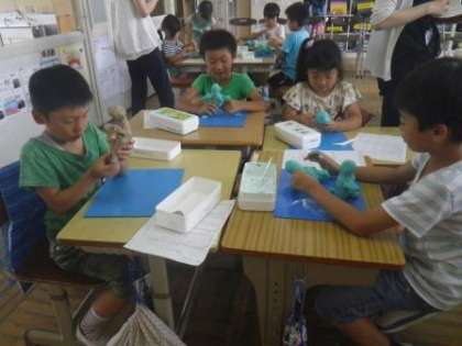 今日は2年1組の教室で、図工の授業の校内研究会を行いました。「かたまりからおもい出の場めんをつくろう」をテーマに、子どもたちが人間の動きを題材に、粘土の固まりから、自分がイメージする人間の形を作り出す造形活動に取り組みました。ダンスの決めポーズを作る子、お父さんとサッカーの練習をしている様子を作る子、魚釣りをしている姿を作る子など、さまざまでした。それぞれ一人一人で作業をするわけですが、途中で苦労したことや困ったことをグループで相談する場面もあり、子どもたちが互いに言葉を交わしたり、作り方を教えたりしながら、楽しく学習していました。みんなの表情がとても良かったことが印象に残りました。楽しいことが何より大切です。