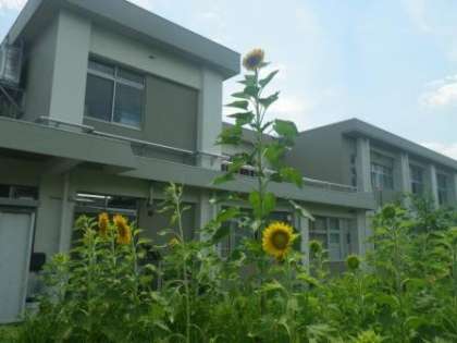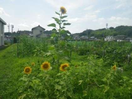 3連休明け、学校の北側の農園をのぞくと、3年生が植えたひまわりの中に、1本だけ飛び抜けて背の高いひまわりが見事な花をつけていました。一つだけ種が違っていたのでしょうか?真相はよくわかりませんが、面白かったので紹介します。