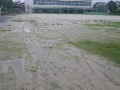 台風5号がゆっくりした速度で近畿・東海地方を通過し、日本列島を縦断しています。昨日から今朝にかけて、たくさん雨が降りました。伊保小学校の体育館は昨日の午後6時から、今朝の午前4時まで避難所として開放され、市の職員が待機していましたが、避難してくる住民の方はいなかったそうです。今朝の学校の様子です。運動場には水たまりが広がり、木の葉や枝があちらこちらに散らばっていますが、被害はありませんでした。