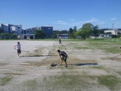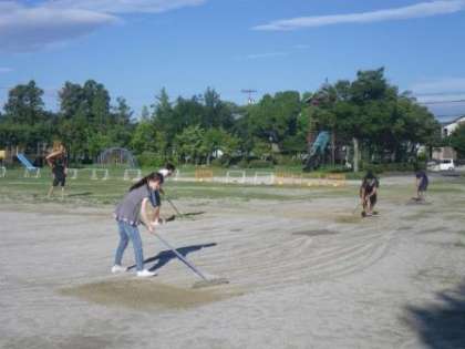 まだ7時にもならない早朝から、運動場に見慣れぬ若者の姿が・・・。これは台風が接近している7日(月)に、本校の運動場を駐車場として使っていただいた豊田市の若い先生方の組織の代表の方々でした。本校の運動場を、研修会のバス出発・到着地として使用したため、大型バスや参加者の自家用車が50台ほど入りました。当日は午後から激しい雨になり、運動場は水浸し。駐車場から車が出た後は、轍(わだち)だらけになりました。運動場が乾いた今日、朝から日差しが強い中、汗びっしょりになりながらグラウンド整備をしてくれました。当たり前のことかもしれません。でも、その気持ちが嬉しいではないですか。子どもたちに見せたい姿でした。