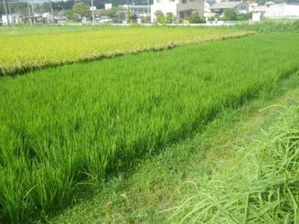 5月12日(月)に、5年生が田植えを行った水田です。3か月を経過した今朝の様子です。ずいぶん大きく育っています。周囲に比べて、やや生長が遅いのは、田植えの時期が少し遅かったせいでしょう。今年の実りはどうでしょうか?