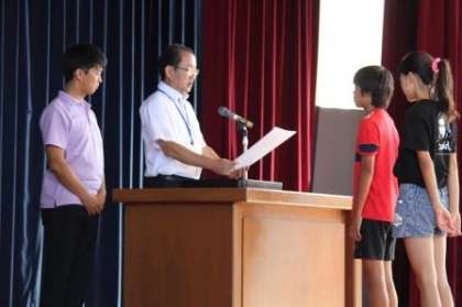 夏休み明けは、全校での集会から始まりました。夏休み中のさまざまな表彰の後、校長の話、生活担当の先生の話、9月からの転入児童の紹介などがありました。子どもたちは大きな声であいさつしたり、拍手をしたりすることができました。良いスタートが切れました。