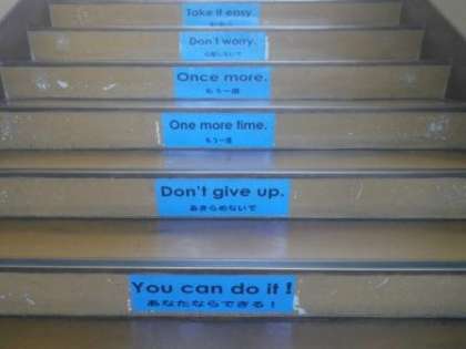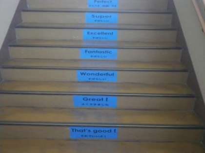 そこで夏休み中に準備を進め、階段に「元気が出る!英語」を掲示しました。今はどう発音すればよいのかわからない子どもたちも、きっとすぐに、こういう言葉を当たり前のように使う日が来ると思います。Let’s begin.(さあ始めましょう!)You can do it.(あなたたちならできるよ!)