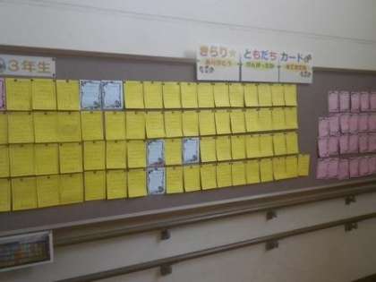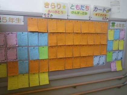 「友だちの良いところを、お互いに認め合おう!」ということで今年から始めた「きらり☆ともだちカード」。各学年の掲示板には、たくさんのカードが貼られています。前期もあと1か月。もっと多くのカードが貼られることと思います。伊保小にはきらきら輝く子どもがいっぱいです。