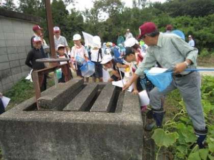 伊保川で魚つかみをする前に、まず、水田に水を取り入れる用水の仕組みを勉強しました。葉瀬森(はぜもり)用水です。葉瀬森用水から取り入れられた伊保川の水は、おもに東保見町や貝津町の水田を潤すそうです。素早く泳ぐ小魚の群れもいました。