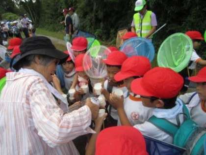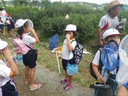 葉瀬森用水から魚つかみをする伊保橋の下まで移動する途中、保全会のメンバーの方が所有する茶畑があります。この周辺では珍しい茶畑です。そこで栽培された「三年番茶」をいただきました。子どもたちは、冷やされた番茶を美味しくいただきました。おかわりしている子どもも多かったです。