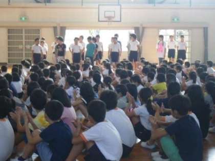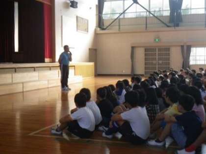 3連休明けの今日は、1時間目の前に全校集会を行いました。今日は5年生の集会委員が集会の進行役を務めました。集会では、校長から「ミサイル発射に対しての避難行動について」、交通安全担当から「通学団での登下校について(台風時の対応を含む)」、6年生から「修学旅行期間中の登下校や清掃などについて」の話がありました。5年生がしっかり取り回しをしてくれました。6年生は安心して修学旅行に出発できそうです。