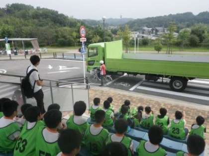 昨日は、午前中の1年生に続いて、午後からは4年生が交通安全学習センターで交通安全について学んできました。4年生はおもに安全な自転車の乗り方について学びました。左折する大型車に巻き込まれやすい状況を実際に見たり、自転車にまたがり、正しい乗り方を体験したりしました。