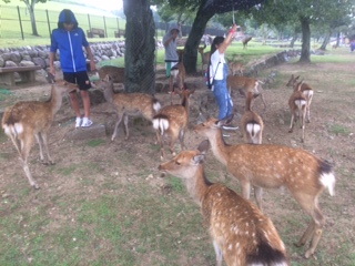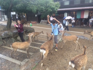 昼食を終え、奈良公園で鹿との交流の様子です。どちらが遊ばれてるのか?非常に良い関係のようです。雨が降り始めました。