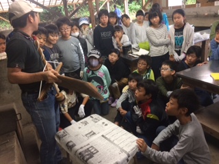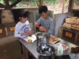 食材を切り、鍋に入れ、火起こしの術を学び、カレーライスを作ります。