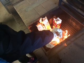 2日目の朝食はカートインドッグ。パンにピザソースを塗り、ソーセージ、チーズを挟んで、ホイルに包み、牛乳パックに入れて、焼きました。