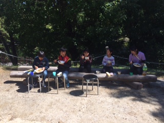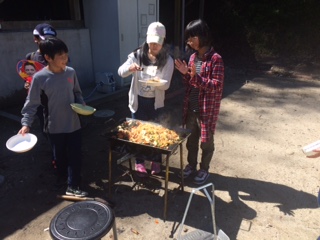 午前中はアスレチックを楽しみ、昼食は焼きそばです。食事を作って、食べて、片付けての繰り返しです。この後は、魚つかみを行います。